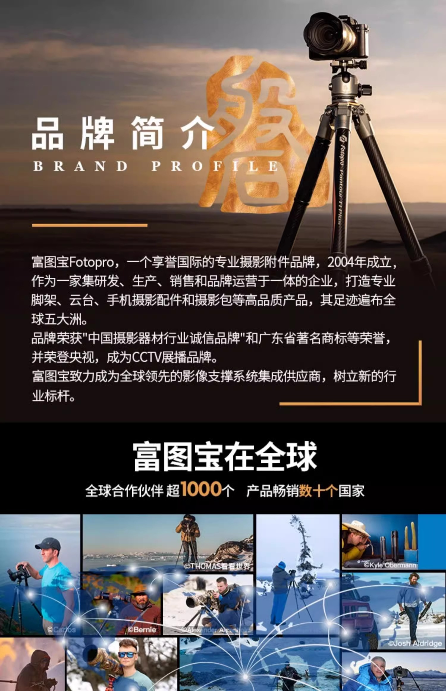 广东富图宝影像工业有限公司拥有二十余年的专业摄影配件设计研发经验,为摄影人提供了一系列高品质摄影配件产品,主营产品包括专业三脚架、云台、手机摄影配件、摄影包、UV镜、户外摄影配件等。